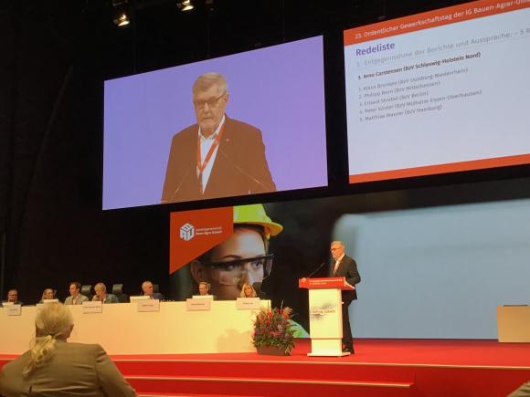 Bezirksvorsitzender Arno Carstensen warb bei den Delegierten des Gewerkschaftstages für die Anträge aus Schleswig-Holstein. Er erinnerte daran, dass die sozialen Aspekte wi...